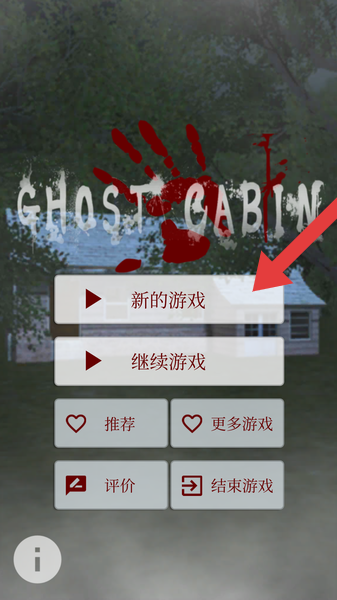 1、进入恐怖脱出游戏幽灵小屋主界面,点击【新的游戏】开启冒险,背景血迹与木屋烘托恐怖氛围,正式踏入避雨惊魂剧情。