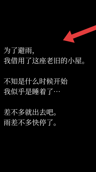 2、黑幕文字叙述「为了避雨,我借用了这座老旧的小屋…雨差不多快停了」,交代事件缘起,引导玩家代入“醒后欲离”的诡异情境。