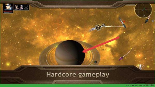 1、进入太空场景,操控飞船(箭头指向),在“Hardcore-gameplay”模式中,探索行星,应对宇宙威胁。