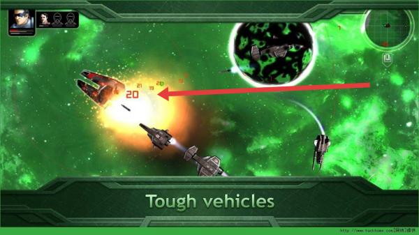 2、战斗时,驾驶“Tough-vehicles”,瞄准箭头指示的敌方飞船,释放火力,摧毁目标,获取资源。
