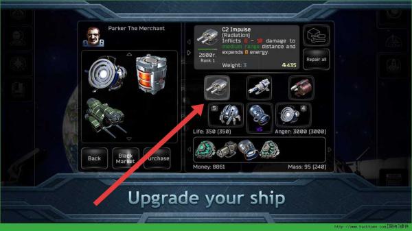 3、在升级界面,选择箭头指向的装备,消耗货币(Money:8861)升级,增强飞船战力,备战新关卡。