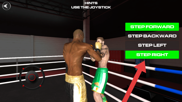 2、这是拳击:冠军之路2的操作教学界面,实体信息有“HINTS:USETHEJOYSTICK”,以及“STEPFORWARD、STEPBACKWARD、STEPLEFT、STEPRIGHT”操作指引。