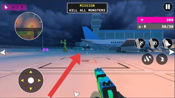 1、场景为机场(有飞机、跑道等),界面显示弹药数(30/30)、积分(260)等,玩家需操控角色用武器射击怪物完成任务。
