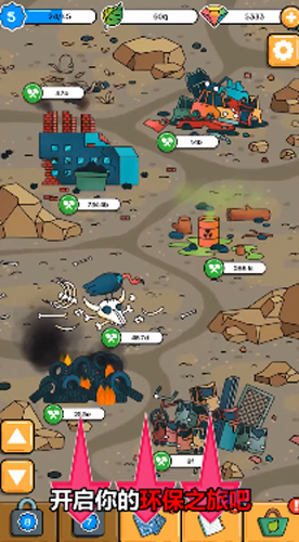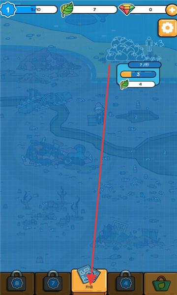 2、环境净化:完成垃圾清理后,触“升级”操作(下方卡牌按钮),提升净化效率,将污染地图(棕色)。