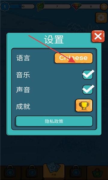 3、设置管理:进入设置界面,调整语言、音乐/声音开关,查看成就进度,通过“隐私政策”了解游戏规则。