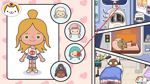 1、在角色装扮页,点击右侧发型图标(如箭头指向的蓝发造型),替换发型,搭配服饰、五官,保存独特角色形象。