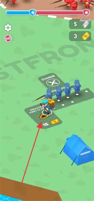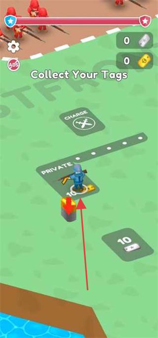 1、点击红箭头“箱子”,收集“Tags”,用于招募士兵、升级兵种,壮大蓝色军队,对抗红色敌军。