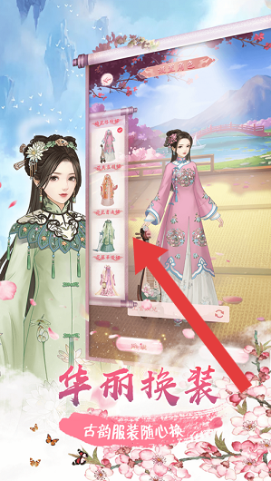 1、进入游戏,在换装界面,点击箭头指向的古风服饰,更换装扮,体验“华丽换装”,打造专属造型。