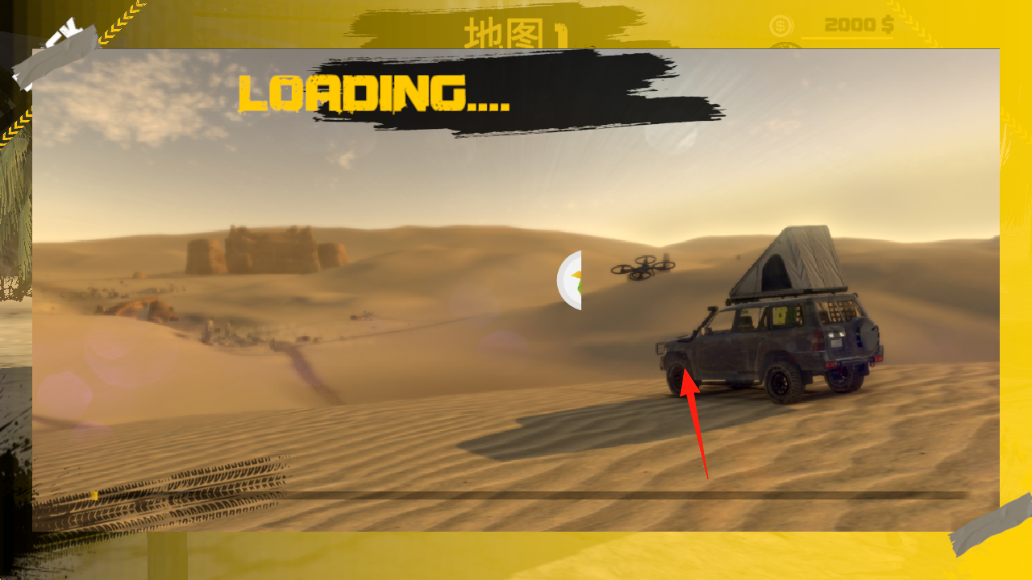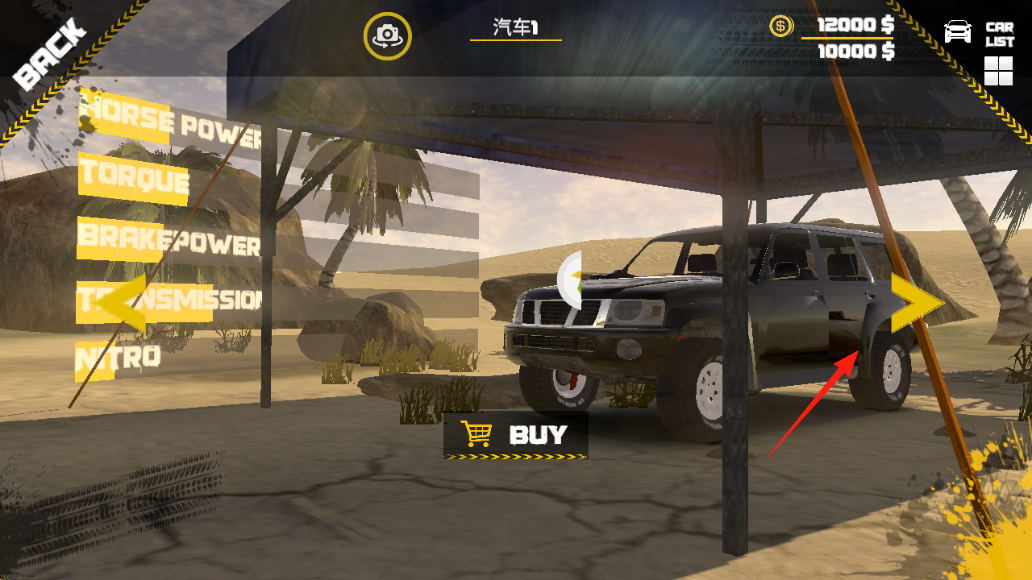 1、玩法流程:点击“PLAY”进入游戏,可在车库界面查看车辆属性(马力、扭矩等),花费金币(12000$)购买越野车,进入“地图1”沙漠场景驾驶。