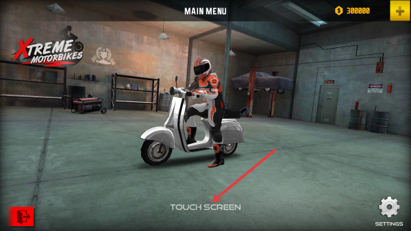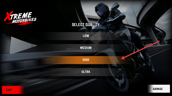 1、选“High”画质,点【GARAGE】进车库,触屏选摩托(如小踏板),开始越野。