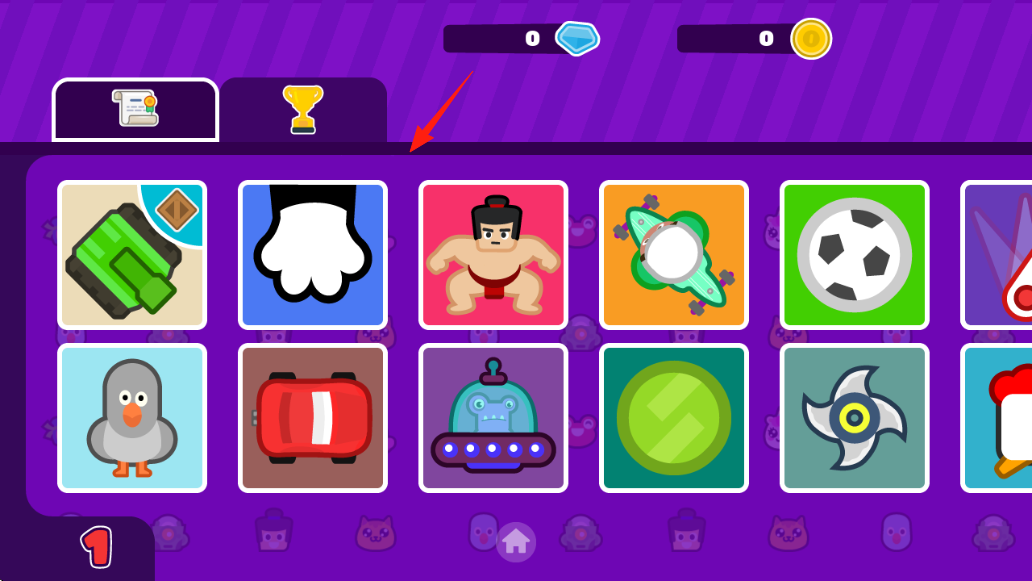 1、模式选择主界面有多种游戏模式(如绿色导弹、巨拳、相扑手等图标),消耗钻石、金币解锁,当前钻石、金币均为0。