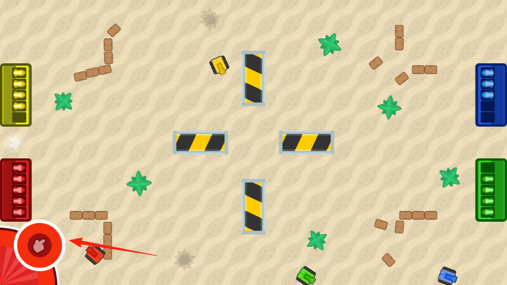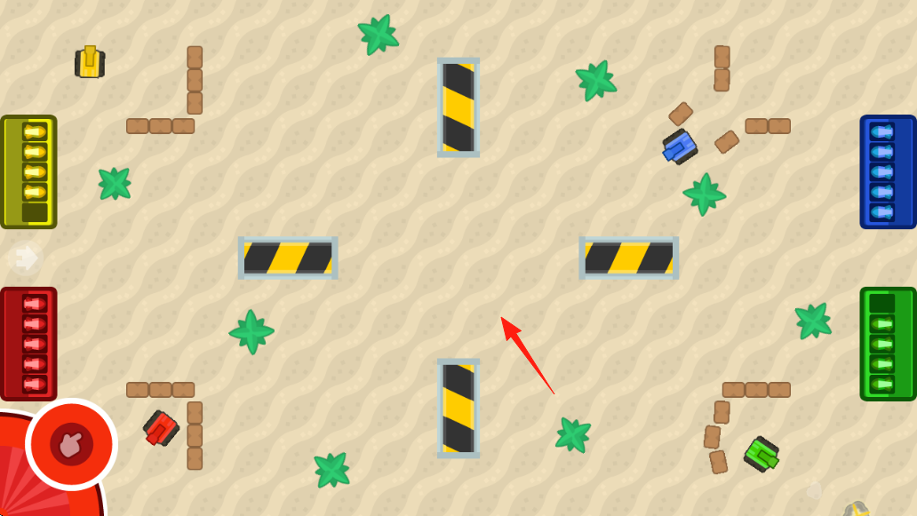 2、玩法机制在沙漠战场,操控坦克(红、黄、蓝、绿等),通过虚拟摇杆调整方向,发射炮弹摧毁敌方坦克,利用地形(障碍、植物)策略战斗。