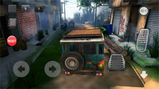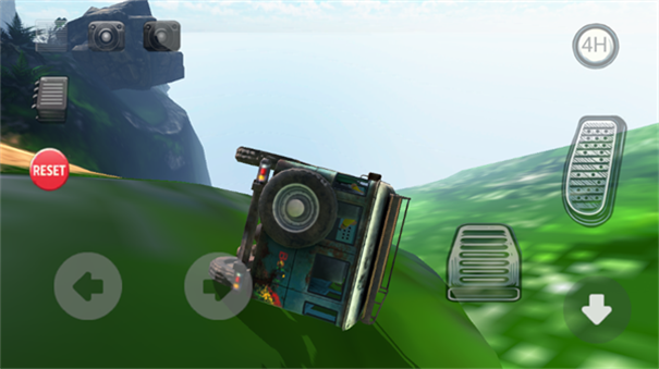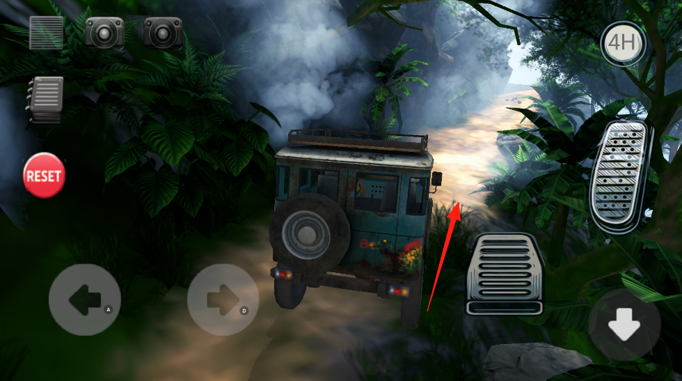 3、有“RESET”重置键、视角设置按钮,显示驱动模式(4H),车辆为改装复古越野车,通过精准操作,提升越野行驶距离与通关率。