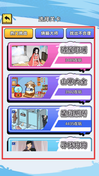 1、启动游戏:点击“开始游戏”,进入关卡选择(如“热门挑战”里的“破屋取暖”)。