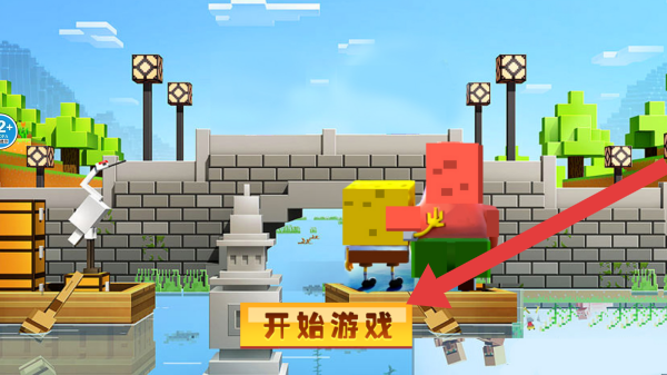 1、结合像素化场景与【开始游戏】按钮,是基于海绵宝宝的像素酷跑或冒险类,呈现出开局引导玩家进入游玩的画面。