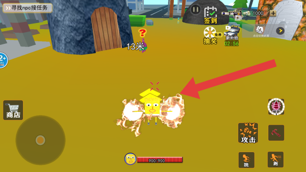 3、角色是海绵宝宝形象,界面有商店、攻击等功能,呈现战斗或技能释放(角色周围特效)状态,玩家操控角色在场景完成任务、战斗等互动。