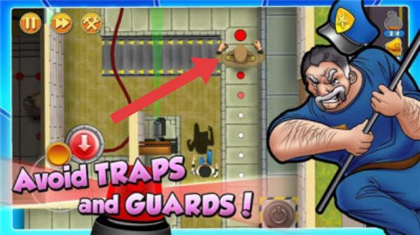 1、属于潜行逃脱类,实体信息有:画面提示“AvoidTRAPSandGUARDS!”,呈现了警卫、陷阱(如激光等)、逃脱路线等元素,玩家需操控角色躲避警卫与陷阱完成关卡。