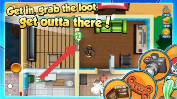 2、实体信息有:标题文字“Getin,grabtheloot,getouttathere!”(进入、抢夺战利品、逃离),呈现了房屋场景、鲍勃、可互动道具(相机等),玩家需操控角色潜行盗窃并逃离。