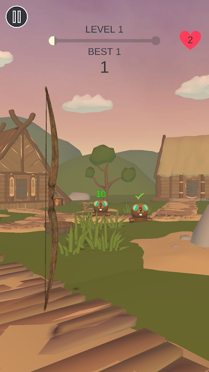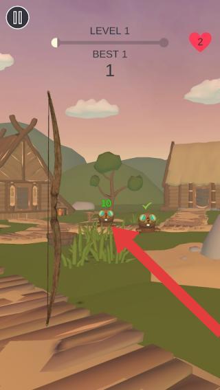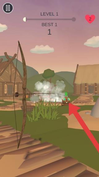 2、处于“LEVEL1(第1关)”,“BEST1(最佳成绩1)”,剩余“2”点生命,画面呈现拉弓射箭命中怪,有乡村场景(木屋、草地等),属于通过物理射箭机制推进关卡的休闲类型。