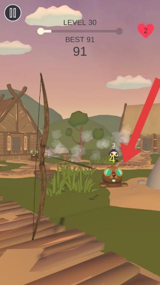 3、关卡为“LEVEL30(第30关)”,“BEST91(最佳成绩91)”,画面有弓箭、带数字“4”的怪物目标、乡村场景,核心玩法是通过拉弓射箭,利用物理弹射机制命中目标推进关卡。