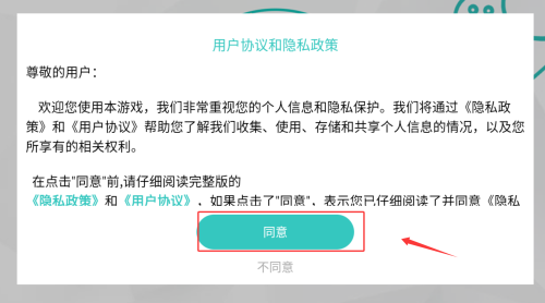1、首次启动需仔细阅读用户协议,确认后点击同意按钮即可进入游戏主界面开始体验。