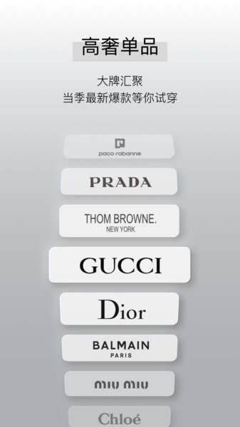 1、高奢体验:点击PRADA、GUCCI等品牌按钮,进入当季新款试穿页,浏览穿搭,保存心仪造型。