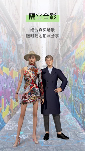 2、隔空合影:选真实场景(如涂鸦墙),导入虚拟人物,调整姿势、服饰,生成合影分享社交平台。