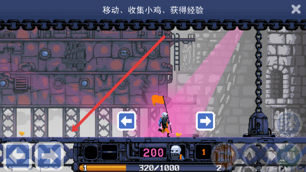 2、在游戏场景,按提示“移动、收集小鸡、获得经验”,操控角色,沿箭头探索,完成基础玩法目标。