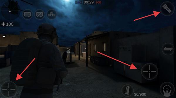 3、可以发现操作还是很简单的,左边可以控制人物移动,右边可以进行射击,右上方也可以开启手电筒。