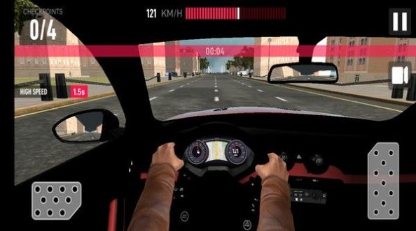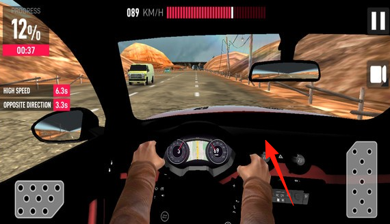 1、玩法机制:第一视角驾驶赛车,通过虚拟方向盘、踏板(油门、刹车),在公路山路场景,控制车速(89、36、121KM/H),躲避对向车辆,完成竞速。