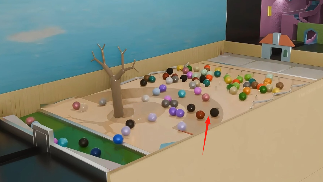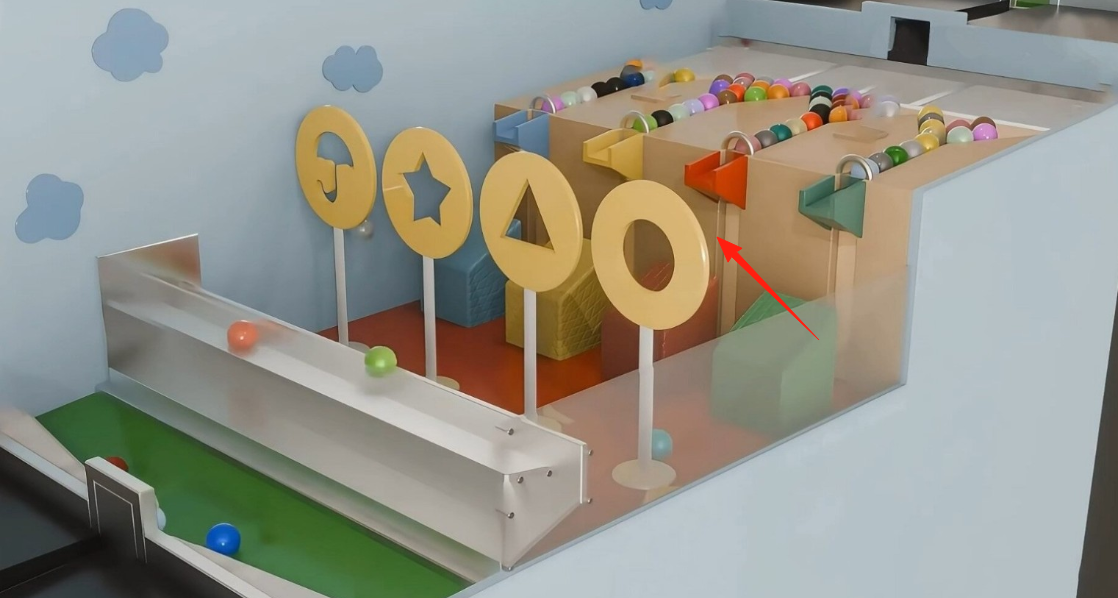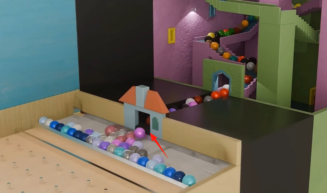 2、含沙盘(树、水池)、紫色建筑轨道、形状匹配门,弹珠多样颜色,场景模拟儿童乐园,锻炼空间、物理认知。