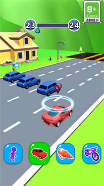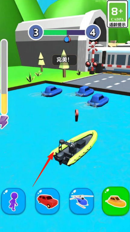 2、场景与模式有街道(房屋、角色追逐)、水域(驾驶橡皮艇)场景,支持角色切换(人形、汽车、直升机、船),通过升级(等级2→3→4)解锁内容。