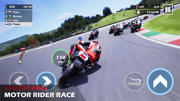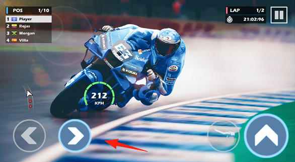 1、玩法机制操控摩托在赛道竞速,通过虚拟按键(左右转向、加速),保持速度(212KPH等),超越对手(Rojas、Morgan等),完成laps(圈数1/2)。