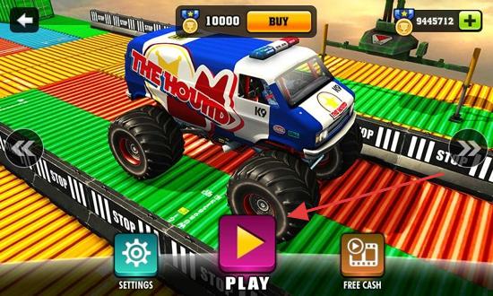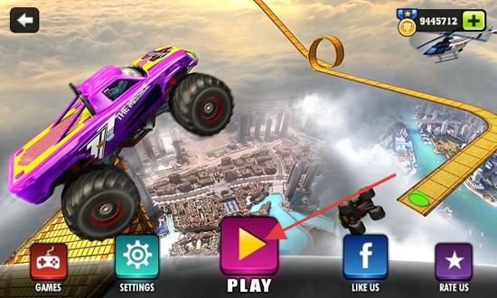2、选紫色赛车,点击【PLAY】,进入高空特技赛道,利用金币【9445712】可后续升级车辆。