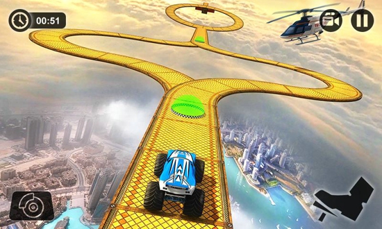 1、操控大脚车,在金色特技赛道行驶,按路线飞越环形、分叉等障碍,注意时间,完成挑战。