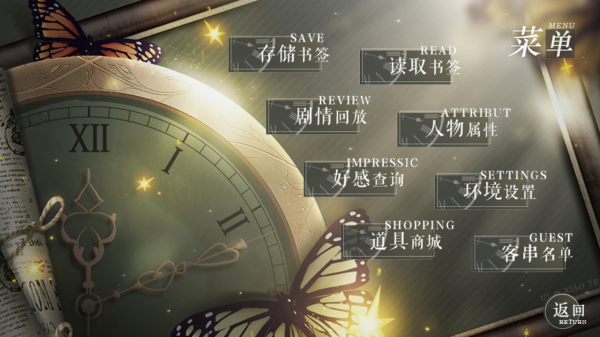 3、菜单中可【存储书签】【读取书签】管理进度,【剧情回放】重温情节,查看【人物属性】【好感查询】,调整【环境设置】,逛【道具商城】或浏览【客串名单】。