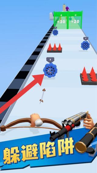 1、画面中有弓箭、枪械等武器,跑道上有蓝色齿轮状、红色锥形等陷阱,呈现出玩家需操控角色躲避陷阱、收集道具并使用武器的场景。