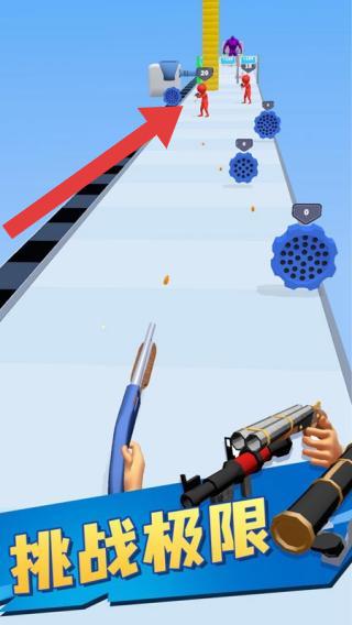 2、画面中有玩家操控的武器,前方道路上分布着蓝色齿轮状陷阱,还有红色小人敌人,展现出玩家需在跑酷过程中躲避陷阱、射击敌人来挑战极限的玩法。