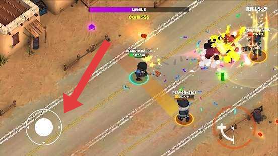 1、在游戏战斗界面,点击左侧的虚拟摇杆(箭头指向的白色圆圈),控制角色移动,躲避敌人攻击并靠近目标。