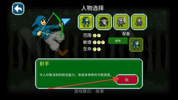 2、在人物选择界面,选择“射手”角色,点击“玩”,利用射手的射击能力和多样的弓箭类型,开始防御战斗。