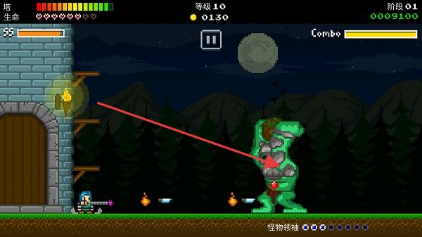 3、在游戏战斗界面,操控射手攻击红箭头所指的怪物首领,升级塔的等级和自身属性,守护城堡。