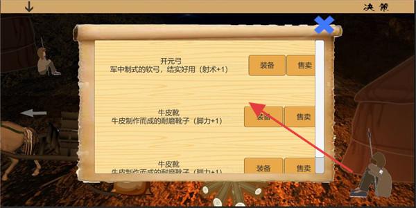 3、装备界面,选“牛皮靴”(脚力+1),点“装备”,提升角色移动、战斗能力,搭配“开元弓”等武器,优化战力,应对后续挑战。