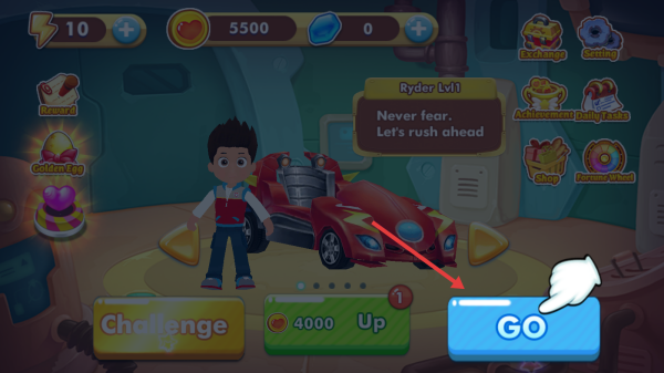 1、主界面点“GO”,选赛车关卡,用虚拟按键(左移按钮)避障碍,沿赛道收集金币。