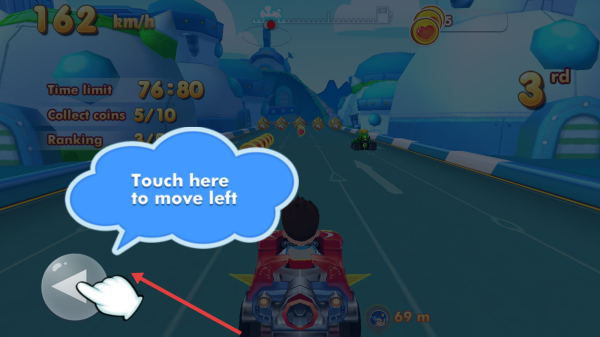 2、注意“Time limit”时间,按指引(左移提示)调整车道,优先吃金币(Collect coins),保排名。