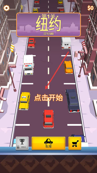 1、点“点击开始”,选第1关纽约街道,按教学(滑动规划路线),避其他车,找车位。