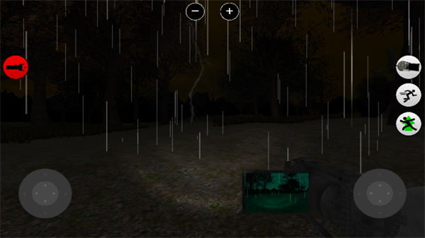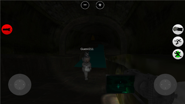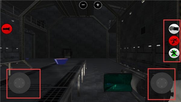 3、游戏的操作也很简单,左边为控制方向健,右边则控制视角,其中的按钮依次为灯开关,摄像机放大,人物的跳和跑健。