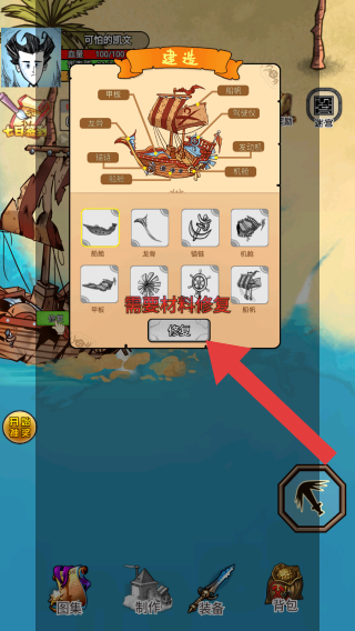 3、界面为“建造”模块,涉及船只修复,需材料(船板、龙骨等8种),还有“修复”按钮,以及底部“图鉴”“制作”“装备”“背包”功能图标。