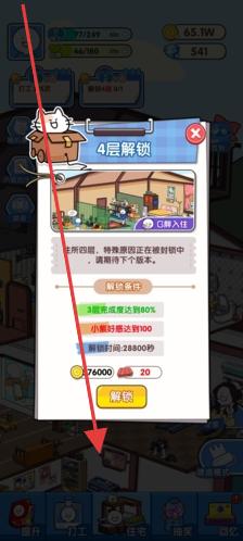 2、住所升级:在“住宅”界面,满足解锁条件(如3层完成度达到80%、小猫好感100等),点击“解锁”升级住所楼层。