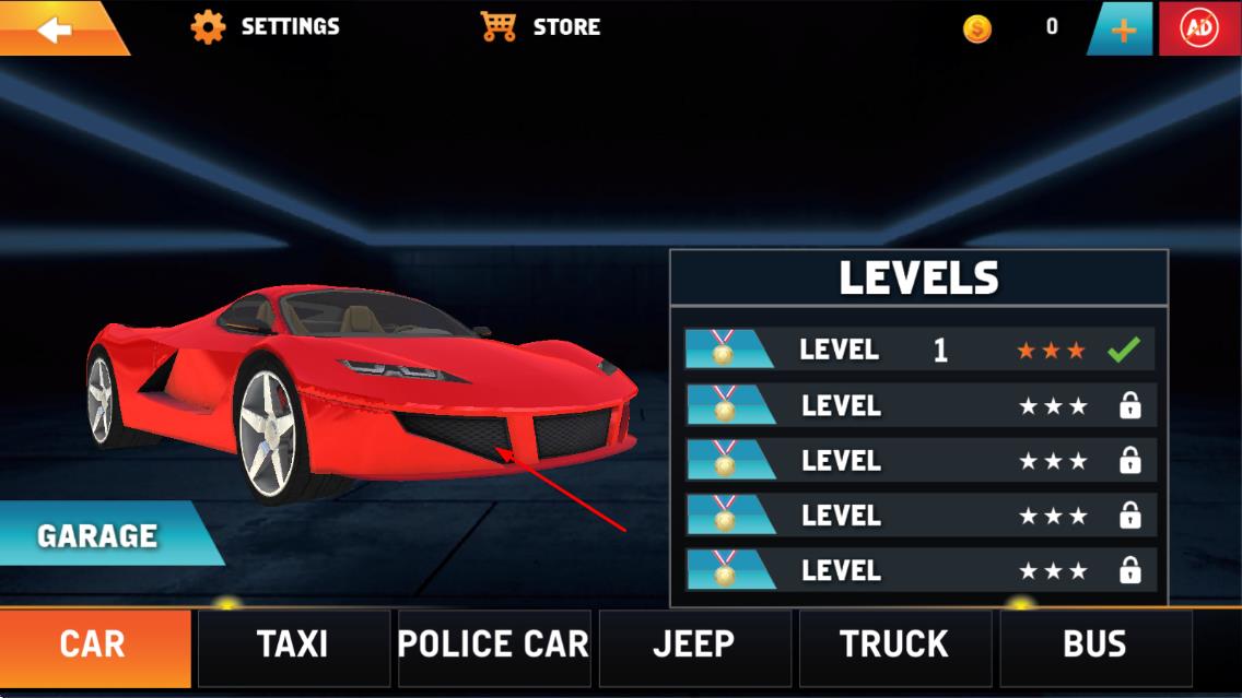 1、进入游戏后在场景界面挑选关卡,从卡车、跑车等车型中选择车辆,做好驾驶前的准备工作。