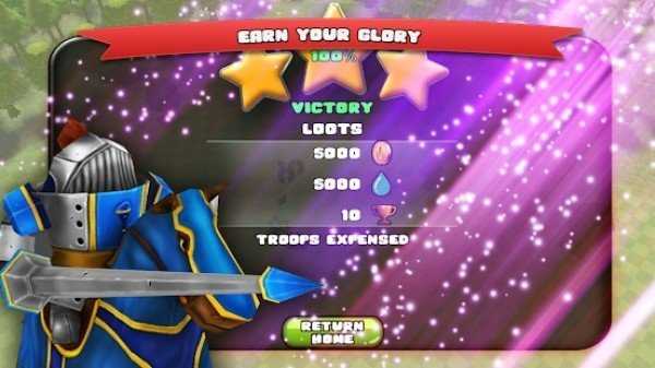 3、战斗胜利后,点击【RETURN-HOME】,返回城镇,领取“EARN-YOUR-GLORY”奖励,准备下一轮挑战。